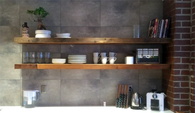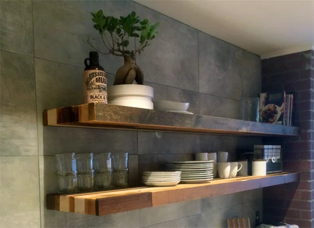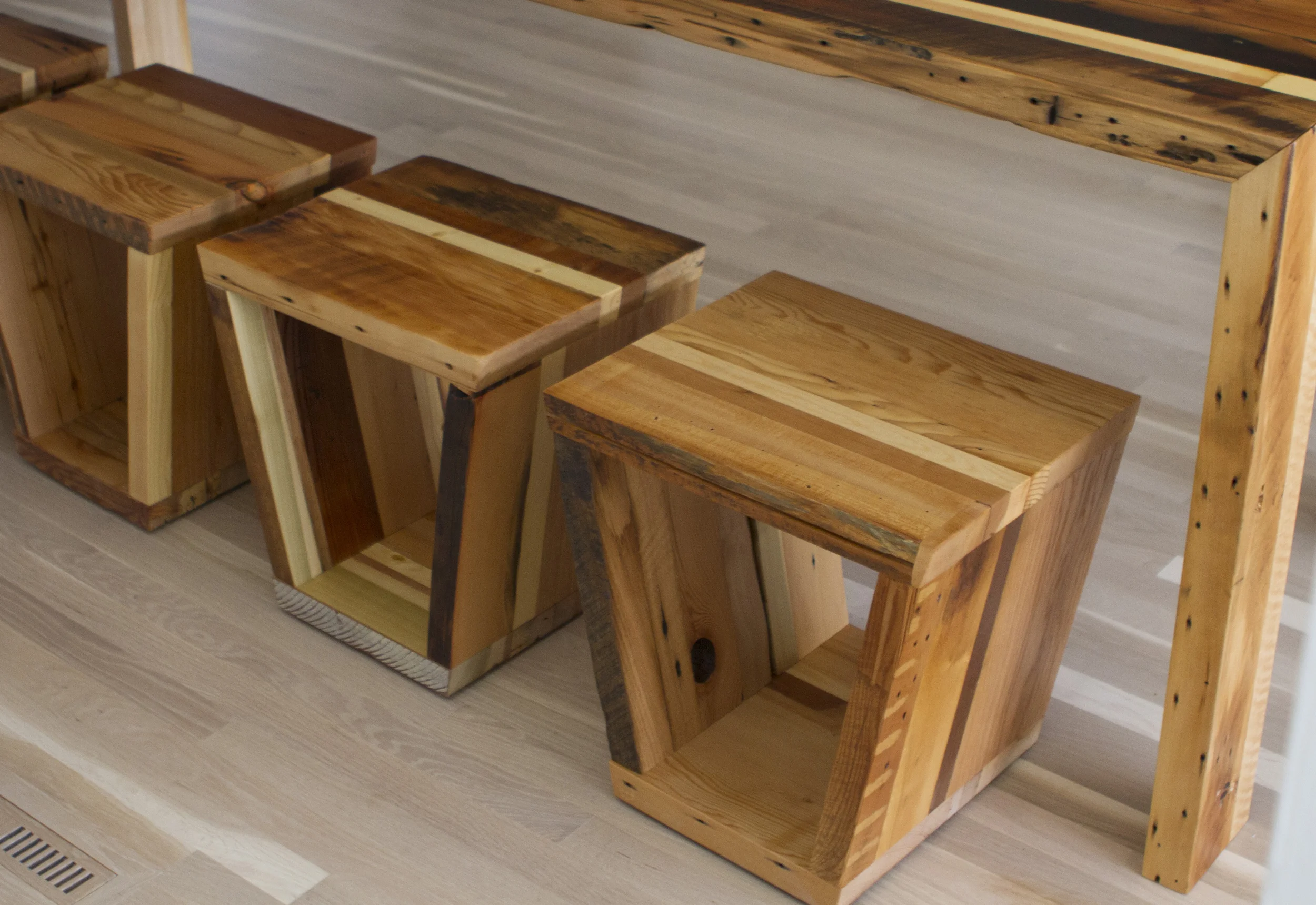 Modern salvaged dining table with matching keystone stools and floating shelves. The table was designed and constructed to have a nine foot clear span between legs for maximum flexibility in seating, which was achieved with a set of custom steel leg assemblies concealed in the wood legs.