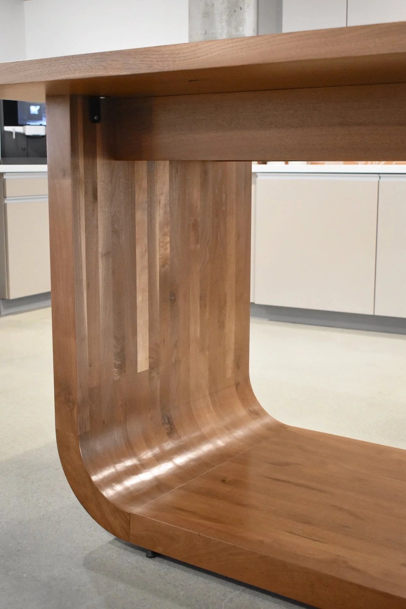 Custom 16’ walnut hardwood high top dining table with integrated power for a communal office kitchen/cafe space. The base is solid walnut with curved finger-jointed trestles at each end.