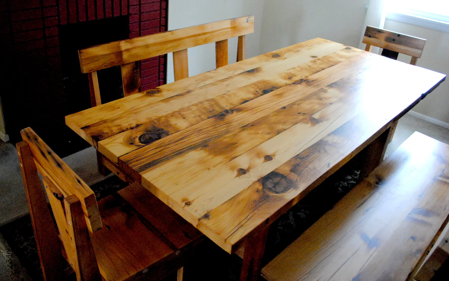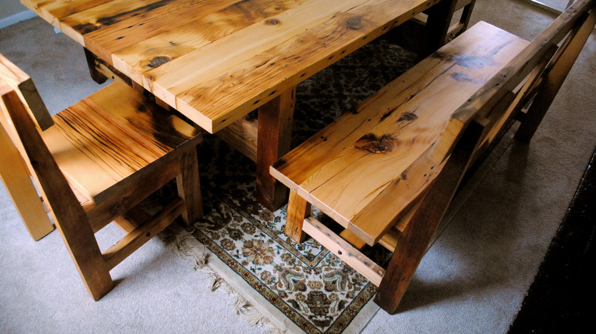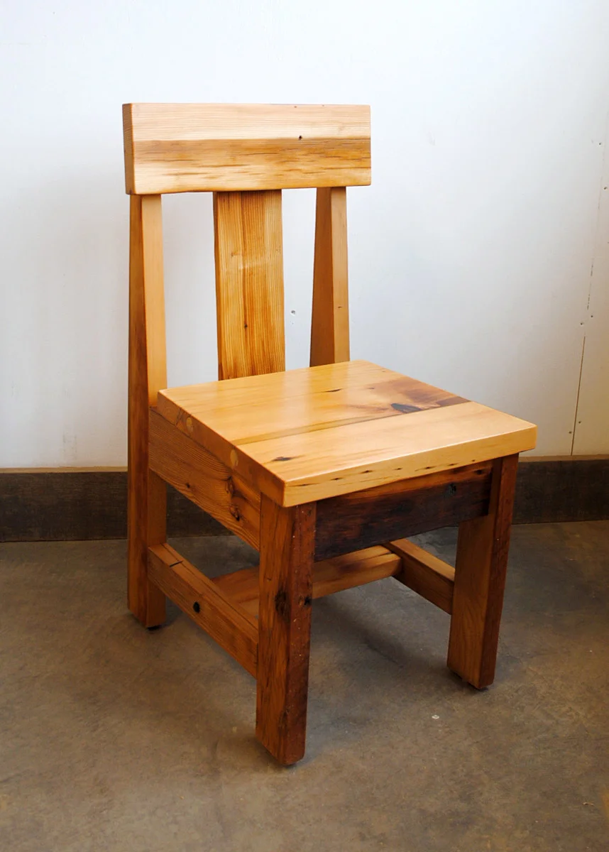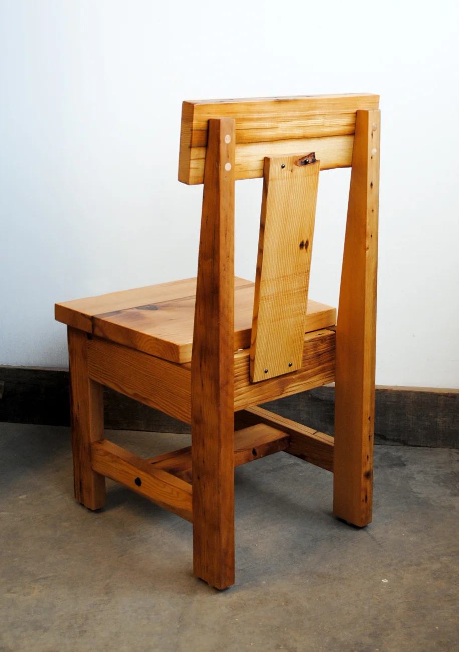 Custom trestle dining table, chairs, and benches built of salvaged fir floor joists.