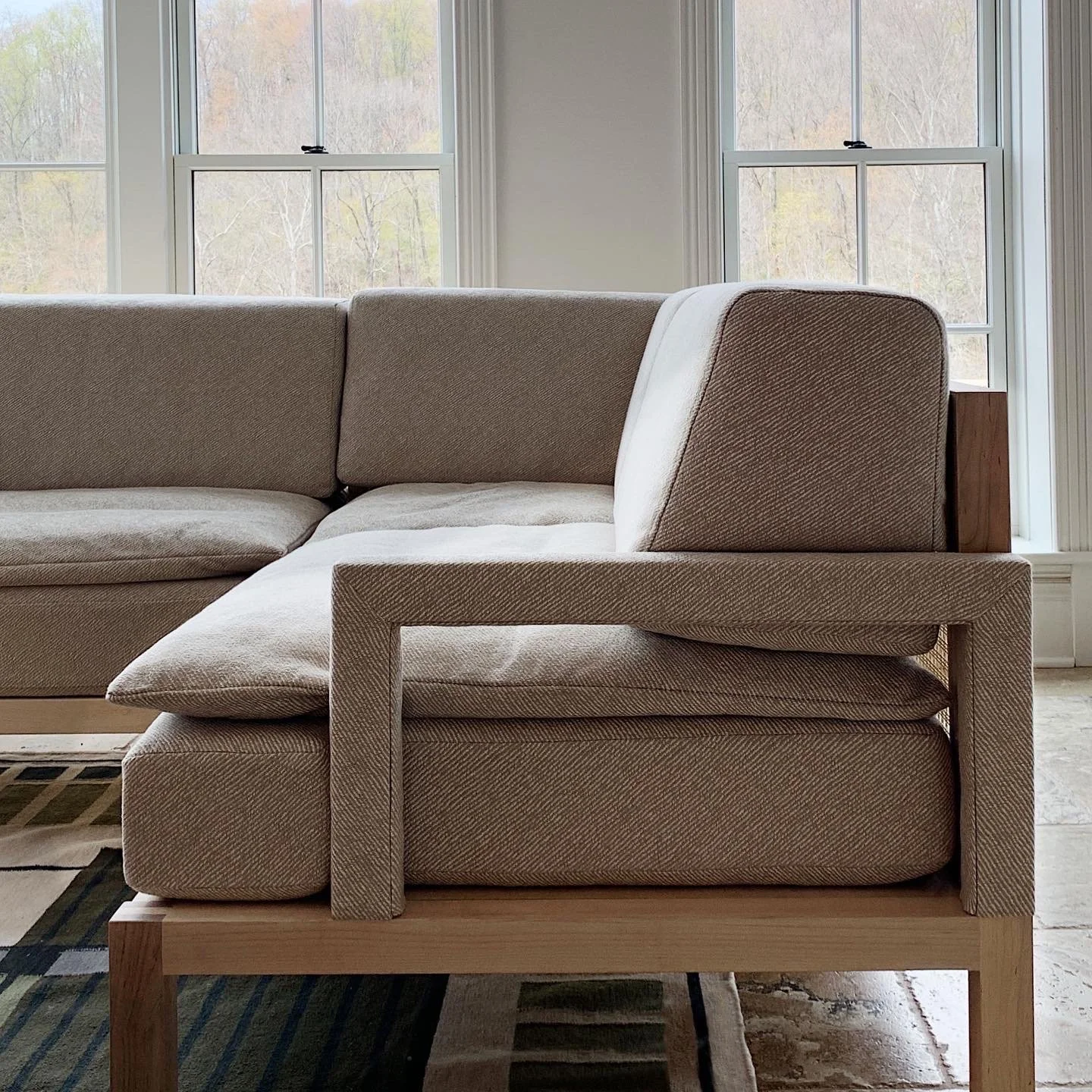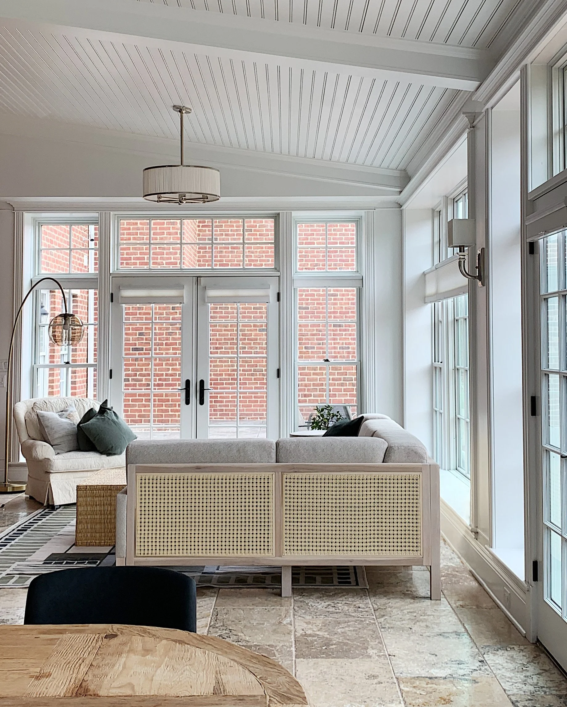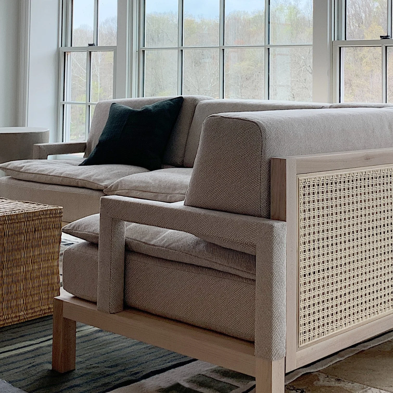 Custom whitewashed maple platform sofa with caned back panels, upholstered arms, and down pillowed cushions.