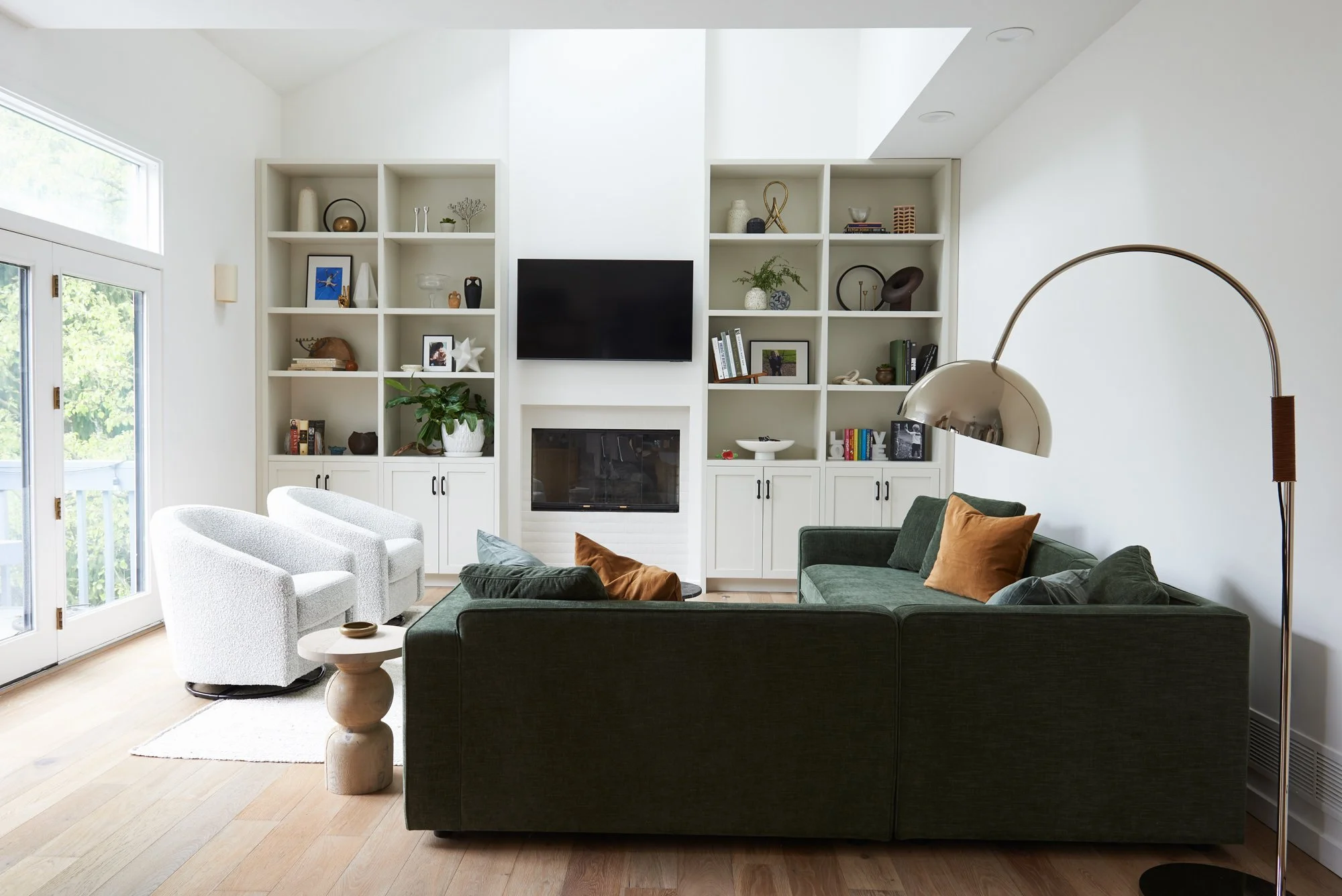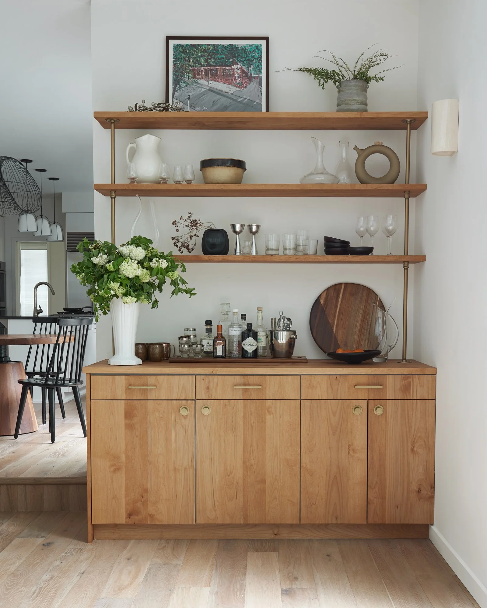 Custom built-ins for a living room update. Mirrored bookcases with movable shelves above and closed storage below flank the fireplace, with a natural alder dry bar across the room. Furniture designed with Studio Lithe, Interior design by Studio Lithe.